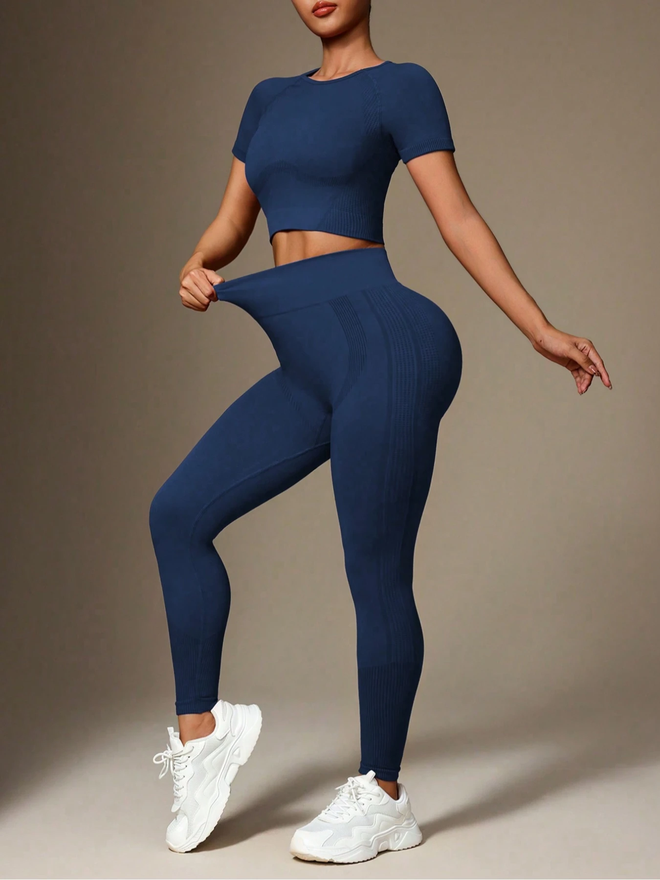 Featuring a short‑sleeve top and high‑waist leggings, this set delivers a flattering silhouette that enhances confidence while allowing full freedom of motion. With its streamlined, pocket‑free design and ankle‑length cut, it’s the perfect choice for women seeking activewear that combines style, flexibility, and everyday functionality.